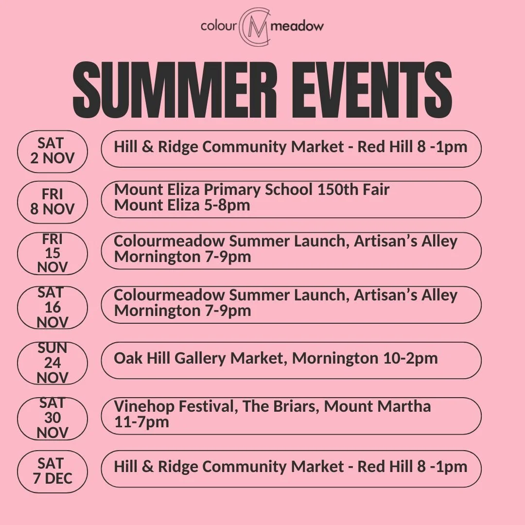 My Summer events in the lead up to Christmas! Lots of wonderful places to find my colourmeadow landscapes as well as my permanent spot at Artisan’s Alley Mornington