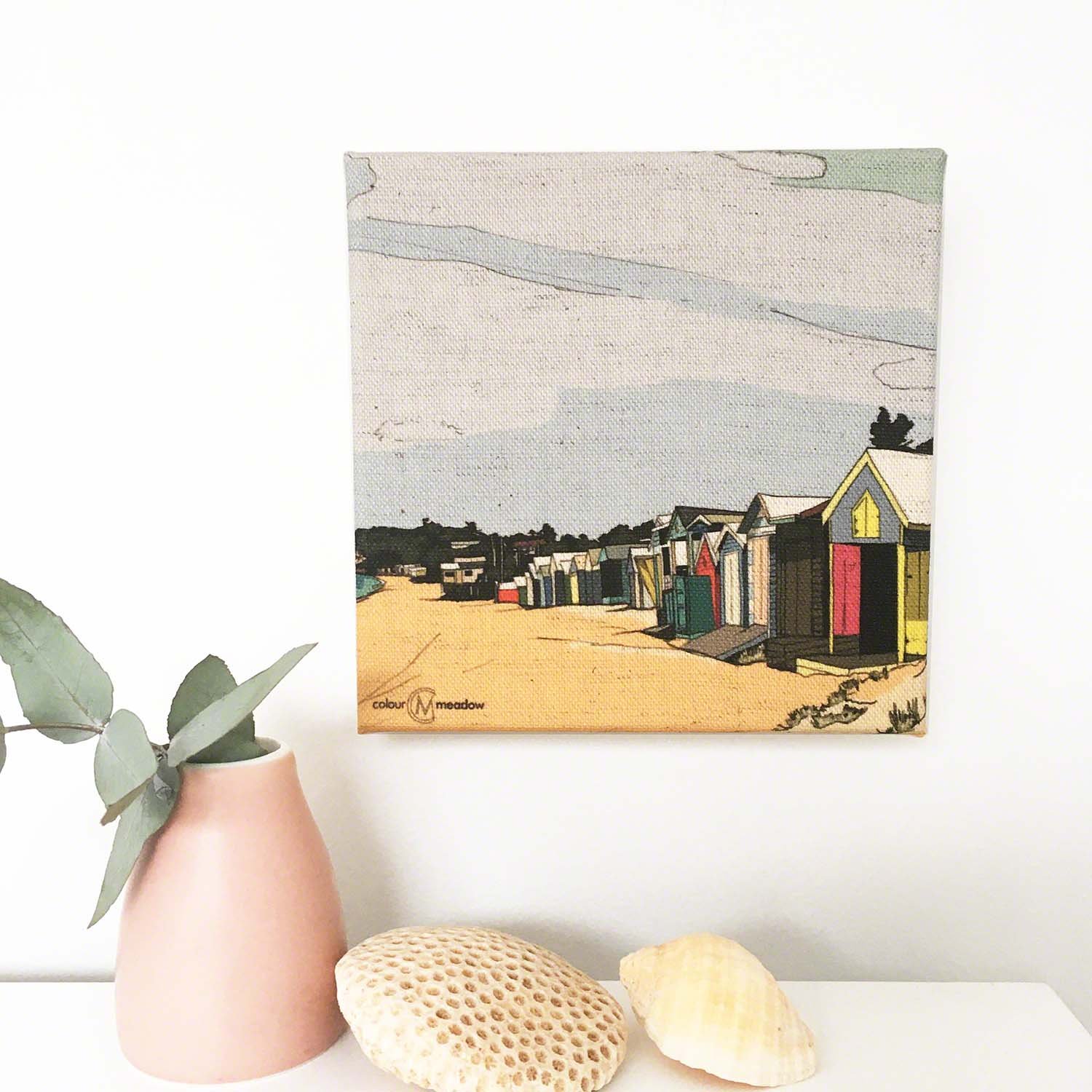 After having a beautiful week at Mornington and loving the little bathing huts on the bay. I was tickled pink to see Colour Meadow at the markets and took Jill’s card to check her website once home in Qld I ordered two mini canvases to have a momento of our holiday. They are gorgeous. Love the colours.